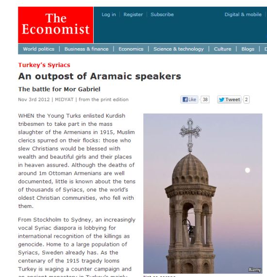 Economist dergisi, Türkiye’deki Süryanilerin de, 1915 olaylarının soykırım olarak kabul edilmesini sağlamak için çabalarını yoğunlaştırdığını belirtiyor ve tarihi manastır Mor Gabriel’in arazisi üzerindeki mücadeleye yer veriyor. Yazıda özetle deniyor: