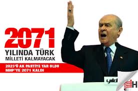 Başbakanın 2071 hedefinin tamamen aldatmaca olduğunu ve asıl manasından uzak kaldığını öne süren Bahçeli, ”Bu gidişle Malazgirt Zaferi’nin bininci yıl dönümünde Anadolu’da Türk milleti kalmayacaktır. Başbakanın 2071 hedefinde Türk milleti yoktur. Başbakanın 2071 hedefinde Türk yoktur, Türk vatanı da yoktur” diye konuştu.