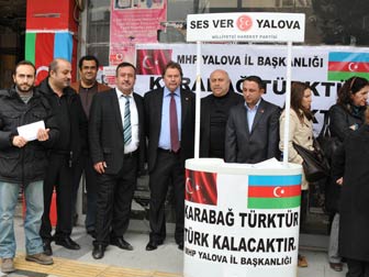 MHP Yalova İl Teşkilatı Dağlık Karabağ için imza kampanyası başlattı. İlk imzayı ise MHP Yalova İl Başkanı Hasan Topçular attı. Burada kampanyanın amacı ile ilgili de bir açıklama yapan Topçular, “Öz Türk yurdu olan ve Azerbaycan’ın %20’sini kapsayan Dağlık Karabağ 21 yılı geçkin süredir işgal altındadır. Medeni Dünya ülkeleri ise bu işgale sessiz kalmaktadır. Ne BM’den, ne AB’den, ne de Müslüman ülkelerden çıt çıkmıyor. AGİK denen maskara kurum ise meseleyi çözmekten çok uzak. Araplar, Farslar ve diğer Müslüman ülkeler neden susuyorlar. Başbakan recep Tayyip Erdoğan Filistin için gösterdiği tutumu Dağlık Karabağ meselesi için neden ortaya koymuyor. Bu zulme sessiz ve tepkisiz kalmamak adına MHP Yalova İl Teşkilatı olarak bu kampanyayı başlattık. Amacımız Yalova’dan Azerbaycan’a, Karabağ Türklerine bir ses vermektir. Bizler Azerbaycan Türkleri ile aynı canın, aynı kanın ve aynı ruhun nefesleriyiz. Onların acısı bizim acımızdır. Burada toplanan imzalar BM ve Beyaz Saraya gönderilecektir” dedi.