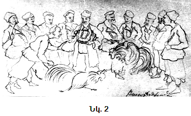 bahse tutuşmaktaydı. Galip gelen hayvan, sahibi ve taraftarları için büyük gurur kaynağıydı. Horoz döğüşleri de ilginçti, bu döğüşler için özel kavgacı horozlar seçilip, çiğ etle besleyip, tırnaklarını bilemekteydiler. (bk. Resim 2) Meskhor’un horoz döğüşleri çok ünlüydü. Lusanuş Girumyan, özellikle siyah horozlar besleyip eğitmekteydi.