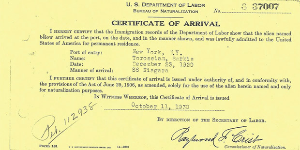 Elimizdeki ikinci ve asıl önemli belge, Torosyan’ın Amerikan vatandaşlığına başvuru sırasında, Çalışma Bakanlığı tarafından kendisine verilmiş, ülkeye giriş tarihini resmi olarak gösteren belgedir. Bakanlık, orijinalini yayınladığımız bu belgede, kendi ellerindeki kayıtlara göre de Torosyan’ın 23 Aralık 1920’de ülkeye resmen giriş yapmış olduğunu bildirmektedir. Belgenin veriliş tarihi 11 Ekim 1930’dur.[25] (Bakınız Belge 3)