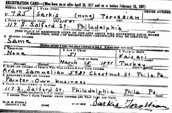 Aslında Amerikan Çalışma Bakanlığı’nın Sarkis Torosyan’ın ülkeye 23 Aralık 1920’de girdiğine ilişkin verdiği bilgi ile bu konuyu kapanmış sayabiliriz. Fakat ben elimde olan bir başka belgeye daha başvurmak istiyorum. Bu belgenin önemi şuradadır ki, belge sadece 1916 giriş tarihinin yanlış olduğunu göstermekle kalmıyor ayrıca Torosyan’ın savaşlara ilişkin aktardığı bazı bilgilerin doğru olduğunu da gösteriyor. Sözünü ettiğim belge, Sarkis Torosyan’ın 1942 yılına ait askerlik yoklama kaydı ve sağlık karnesidir. (Bakınız Belge 4)