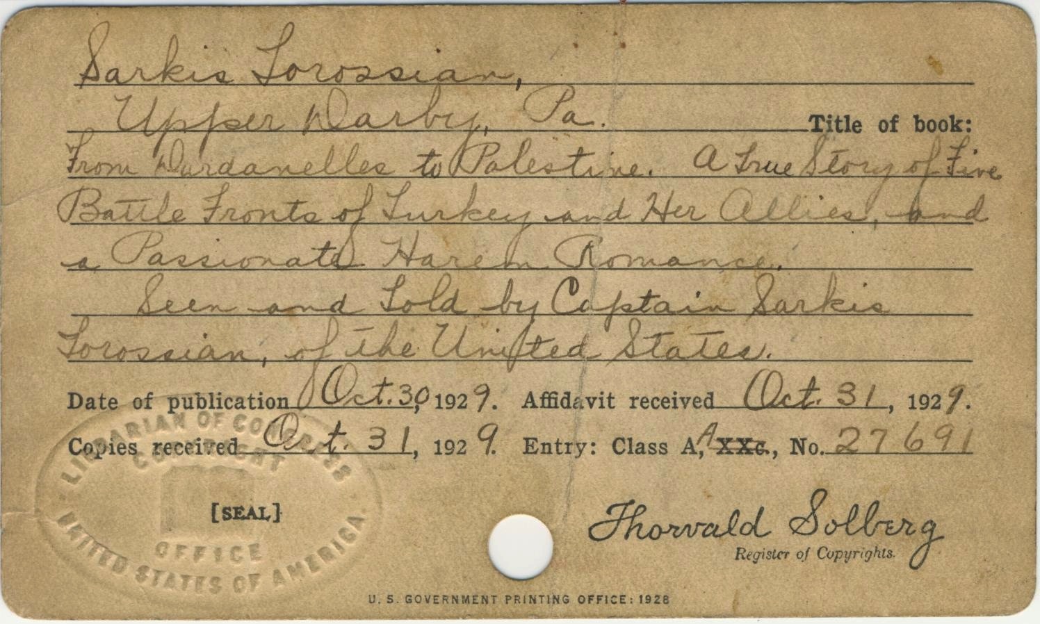 Yüzbaşı Torosyan’ın kitabı, yukarda anlattığımız tarza çok uygun bir örnek teşkil eder. Hikâyesini Ermenice olarak anlatmış, eve gelen ve iyi İngilizce bilen bir hanım anlatılanları çevirip daktilo etmiştir. Nitekim burada belgesini yayınladığımız Yüzbaşı Torosyan’ın anılarının 1929 yılında Library of Congress’e teslim belgesinde de görüleceği gibi, kitabın Yüzbaşı Torosyan tarafından “görüldüğü ve anlatıldığı” gibi olduğu ifadesi yer almaktadır.