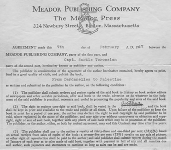 Torosyan’ın, Büyük Buhran yıllarında parası olmadığı ve yayınevi de bulamadığı için 1947 yılına kadar beklediğini anlıyoruz. 1954 yılında New York’taki hastane tarafından verilen ölüm belgesinde mesleğinin müteahhit olarak geçmesinden iş kurduğu ve para kazandığı sonucunu çıkartmak mümkün. Nitekim 1947 yılında Boston’da bulduğu yayınevi ile yaptığı antlaşmanın beşinci maddesine göre Torosyan kitabın basım masraflarına katılmayı kabul etmiş ve 1650 Amerikan doları ödeme sözü vermiştir. (Bakınız Belge 6) Elimizdeki makbuzlardan ise Torosyan’ın 1950 dolar ödediği anlaşılıyor. Yani, anlaşmada olandan fazla ödeme yapmıştır. Muhtemel ki eşe–dosta dağıtabilmek için kendi kitabını satın almıştır. Torosyan’ın yayınevine ödediği para, bugünün değerleri ile 20,000 dolar civarındadır ve bu oldukça büyük bir meblağdır.