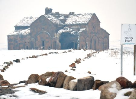 Kent merkezine 42 kilometre uzaklıkta, Aras Nehri’nin batı yakısında tektonik bir alan olan Ani Ören Yeri’nin üzerinde bulunan eserler, kar yağışı sonucu oluşan beyaz örtüyle farklı bir güzelliğe büründü.