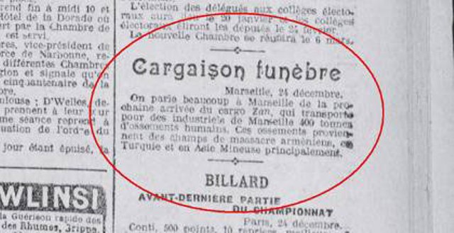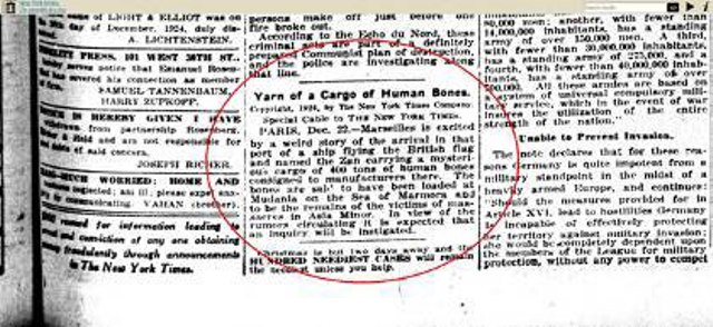Newyork Times ise aynı haberi 23 Aralık 1924 tarihinde ” İnsan Kemiklerinin Taşındığı Bir Yükün İnanılmaz Hikayesi ” başlığıyla sunar: Haberde, Marsilya’ya giden bir İngiliz gemisinin limanda yaşanan kargaşa nedeniyle 400 ton insan kemiği taşıdığı ve bu kemiklerin Mudanya’dan alındığını söyler. Bu kemiklerin büyük ihtimalle katledilen Rumlara ait olduğunu ve bu geminin dolaşımını engellemek için soruşturma emri verilmesi gerektiğini aktarır.