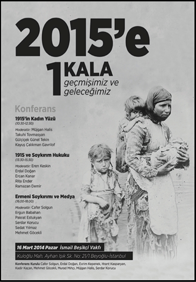 1915 Ermeni Soykırımı’nın 100. yıldönümüne bir yıl kala, İstanbul’da bir konferans düzenleniyor. “2015’e 1 Kala: Geçmişimiz ve Geleceğimiz” başlıklı konferansı aralarında hukukçular ve gazetecilerin olduğu bir sivil inisiyatif düzenliyor. “1915’in Kadın Yüzü”, “1915 ve Soykırım Hukuku”, “Ermeni Soykırımı ve Medya” başlıklı üç oturumun düzenleneceği konferans, 16 Mart 2014 Pazar günü saat 10.30 ‘da İstanbul’daki İsmail Beşikçi Vakfı’nda başlayacak. Konferansın çağırıcıları arasında Av. Erdal Doğan, Cafer Solgun, Müjgan Halis, Mehmet Göcekli, Kadir Kaçan, Hrant Kasparyan, Serdar Korucu, Murad Mıhçı, Evrim Kepenek yer alıyor.