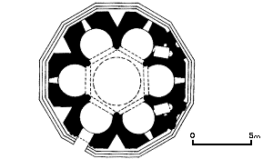 Dış planı, on iki yüzlüdür; girişi ise alışıldık doğu-batı ekseni üzerinde değil, güneybatı tarafındandır. Her yüzü, değişimli olarak derin niş veyahut küçük pencerelidir. İstisna, iki nişin daha sığ olduğu ve cepheden çıkıntı yapan medhal dikdörtgen yapıya oturtulmuş olduğu doğu cephesidir. Bu alışılmadık çıkıntıların alt kısımları kayıptır, ama belki khatchkar veyahut da yazıt gibi önemli bir takım şeyler barındırdıkları ya da mezarlara işaret ettikleri düşünülebilir.