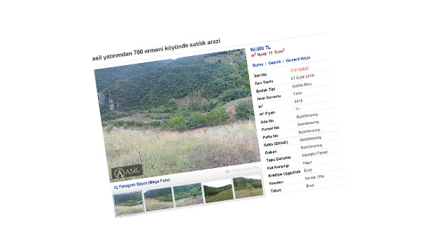 Bir gayrimenkul danışmanlık şirketi, internette en çok tıklanan bir alışveriş sitesine, “700 yıllık eski Ermeni yerleşim yeri” ve “700 yıllık eski Ermeni köyü” başlıklı ilanlarla iki arsayı satışa çıkardı. Bursa’nın gemlik ilçesine bağlı Güvenli köyünde, biri 8 bin 416 metrekare ve 90 bin lira, diğeri ise bin 989 metrekare ve 105 bin lira olan iki arsa için verilen ilan metinleri tepki topladı. İlanlarda yer verilen, “700 yıllık Ermeni eski yerleşim yeri olarak bilinen doğayla iç içe göl, deniz, doğa manzaralı bu eşsiz 100 hanelik köyde emekliliğin huzurun keyfini çıkartmak, aranıp bulunamayacak köy hayatı isteyenler için eşsiz bir arazi. Arazimizin içerisinde ceviz, elma, armut, kiraz, fındık, incir her türlü meyve ağacı bulunmaktadır” ile “700 yıllık Ermeni yerleşim köyü olarak bilinen arazimiz doğa, göl, deniz manzaralı olup yeni yapılan otobanı görmek kaydıyla siz değerli yatırımcıların beğenisine sunmaktayız” ifadeleri dikkat çekti.