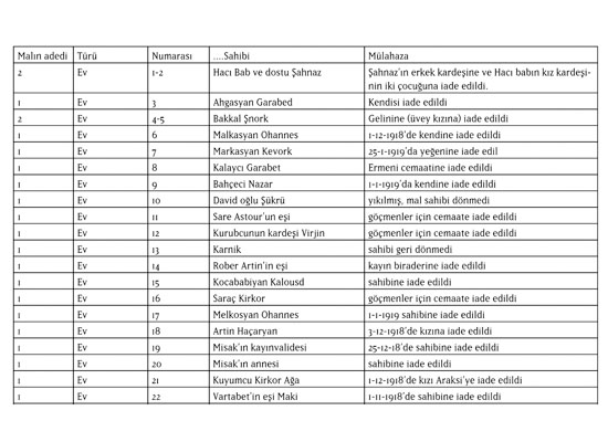 Toplumsal Tarih dergisinin Kasım sayısında Ümit Kurt tarafından yazılan “I. Cihan Harbi Sonrası Ermeni Mallarının İadesi: Cebel-i Bereket Örneği” makalesinde yayımlanan tarihi bir belge, hayli dikkat çekici. 10 Nisan 1919 tarihli belgede, 1915 Ermeni Soykırımı’ndan kurtularak Cebel-i Bereket’e (Osmaniye’ye) geri dönebilen Ermenilere iade edilen mallarının tam listesi bulunuyor. 19 Aralık 1918’de Fransa işgaliyle birlikte bölgeye atanan Askeri Vali Albay Brémond’un gayretleriyle, söz konusu bölgeye geri dönebilen Ermenilere ait olan malların listesinin yanı sıra, belgede, Dörtyol’da ailelerine teslim edilecek Ermeni kadın ve çocuk kalmadığı bilgisi de yer alıyor. Belgeye düşülen 12 Nisan 1919 tarihli ve Cebel-i Bereket Mutasarrıfı Hüsnü Bey imzalı nota göre, Osmaniye’de el konulan tüm mal ve tarlalar sahiplerinden alınıp asıl sahiplerine iade edilmiş. Ayrıca, 18 parça mal varlığı ve tarla da Ermeni cemaatine devredilmiş. Aynı notta, Osmaniye’de iade edilecek başka bir mal varlığı kalmadığı da belirtilmiş. Kurt’a göre, 1921’de Fransa birliklerinin bölgeden çekilmesiyle, malların Ermeni sahiplerine iadesi süreci akamete uğramış ve 1915 yılında çıkarılan Emval-ı Metruke ve Tasfiye Kanunları’na geri dönüş yapılarak, mallara tekrar el konulmuş.