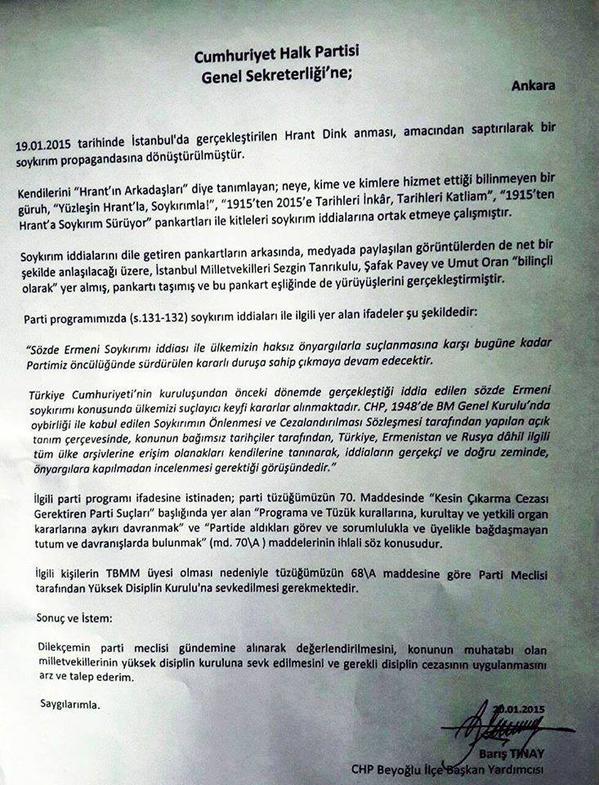 Barış Tınay’ın parti merkezine gönderdiği dilekçede CHP parti programında Ermeni Soykırımı’nın inkar edildiğini belirtilerek CHP’li vekillerin“Yüzleşin Hrant’la, Soykırımla!”pankartının arkasında yürümesinin parti programına uymadığı iddia ediliyor.