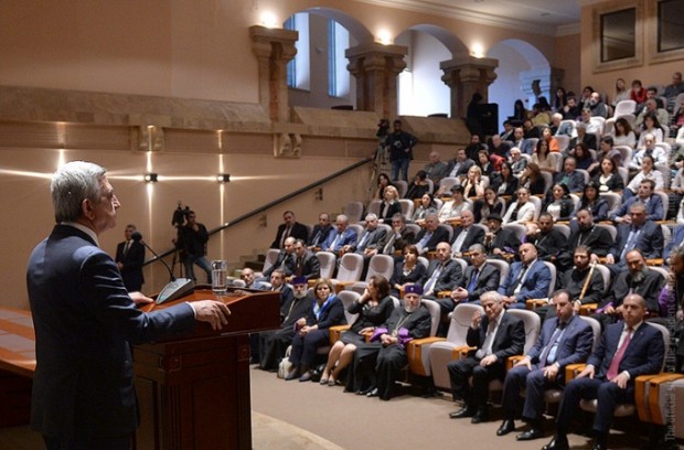 Cumhurbaşkanı Serj Sarkisyan, Dünya Ermenileri Katolikosu Garegin II’yle beraber bugün 17 Nisan’da Mesrop Maştots Eski Yazmalar Matenadaran Enstitü-Müzesinde Ermeni Soykırımının 100. Yıldönümüne yönelik «Kurtulan Elyazmaları» sergisinin açılışına ve «Kemalist Kırımlar» filminin prömiyerine katıldı.