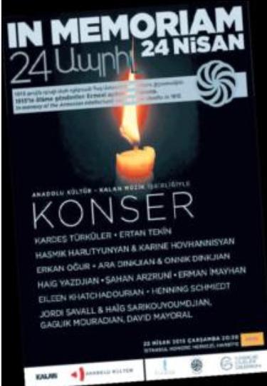 İstanbul’da, 1915 yılında ölüme gönderilen Ermeni aydınların anısına onların seslerini duyurmak için “In Memoriam 24 Nisan” başlıklı bir konser düzenleniyor. Anadolu Kültür ve Kalan Müzik işbirliğiyle düzenlenen konser 22 Nisan saat 20.30’da İstanbul Kongre Merkezi’nde yapılacak.