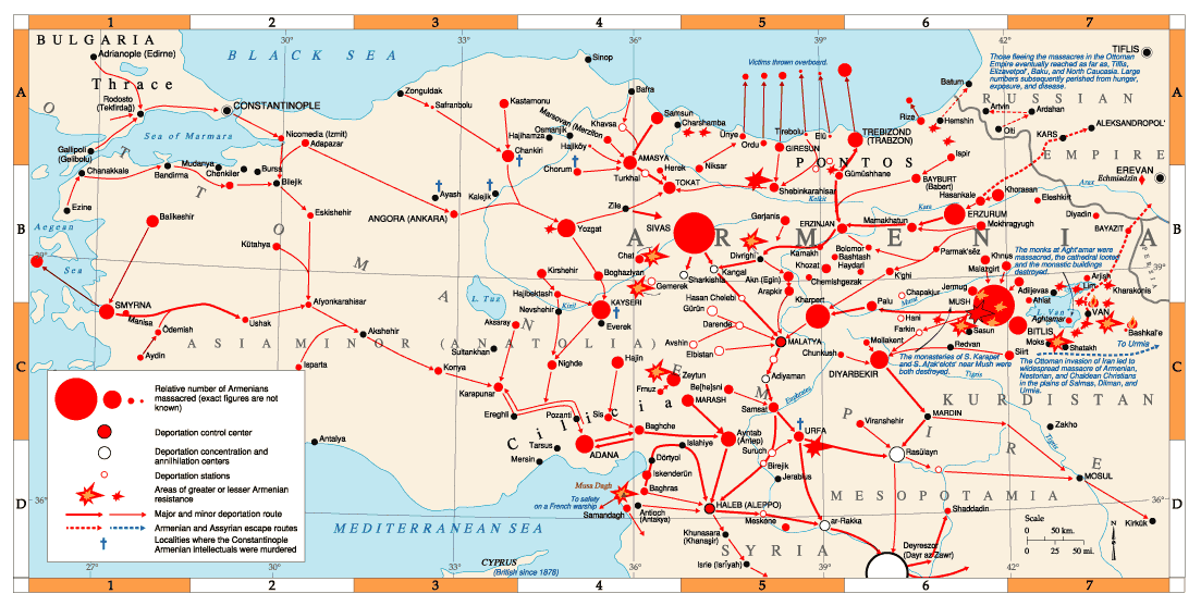 Batı Ermenilerinin tehcir ve katledilmesine 1914 sonbaharı ve özellikle de 1915 ilkbaharından itibaren başlanır. Ermeni halkı, Osmanlı yöneticileri tarafından Mezopotamya çöllerine sürülür. Ermenilerin mal varlığına, tehcir öncesinde veya esnasında el konulur. Güzel kızlar ve kadınlar cebren Müslümanların haremlerine katılır. Tehcir edilenler, tehcir edilecekleri yerlere ulaşana kadar farklı Kürt ve diğer Müslüman çeteler ile tehcir edilenlere refakat eden askerler tarafından şiddete maruz kalır. Yola devam edemeyenler hemen öldürülür. Tehcir edilenlerin çok az bir kısmı yerlerine varır. Örneğin, Trabzon’dan tehcir edilen 3 bin kişiden sadece 35 kişi Halep’e ulaşır. Geri kalanlar ya öldürülür, ya açlık veya susuzluktan, ya da farklı hastalıklardan ölür.