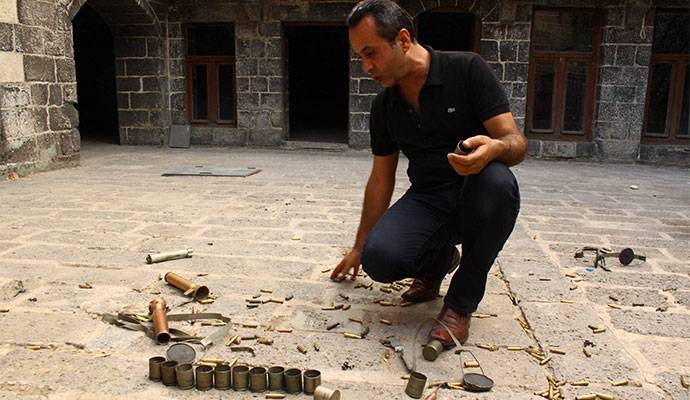 AMED / DİHA – Sûr’da sokağa çıkma yasağı sırasında Amed Ermeni Katolik Kilisesi de polis kurşunlarının hedefi oldu. Hasırlı Mahallesi’ndeki bin yıllık kilisenin birçok odasında, mermi kovanları, roket atar ve gaz kapsülleri çıktı. Kilisenin birçok yeri hasar görürken, saldırıyla yetinmeyen polisin, bazı tarihi eserleri çaldığı iddia edildi. Suç duyurusunda bulunacaklarını söyleyen Mezopotamya Ermeniler Derneği Başkanı Arat Karagözyan, “Polis, kiliseye tarihi kapıları kırarak girmiş. Kilisenin maddi zararı yaklaşık 300 bin TL. Kiliseye yönelik büyük bir saldırının gerçekleştirdiği ortadadır” dedi. Kiliseye yönelik saldırının kabul edilemez olduğunu dile getiren Karagözyan, “Buraya neden bu kadar yöneldiler? 6 adet tarihi çini tablo ve depomuzda bulunan nakışlı tarihi taşlar çalınmış. Kilisenin bütün kapılarını kırarak, içeri girip saldırmışlar” diye konuştu. Cizîr’de polisin anonslarla halka “Hepiniz Ermenisiniz” diye seslendiğini hatırlatan Karagözyan, “Ermenileri kötü bir şey olarak tanıtıyorlar” dedi.