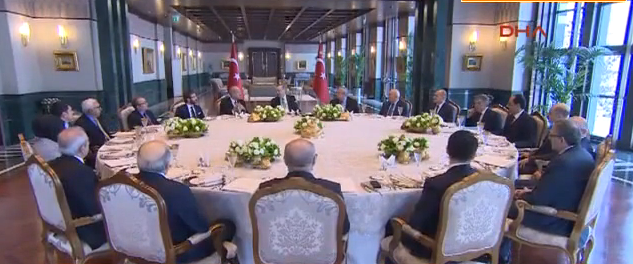 Cumhurbaşkanı Recep Tayyip Erdoğan, geleneksel hale gelen Cumhurbaşkanlığı Sofrası’nda ağırladığı akademisyen ve yazarlarla bu kez ‘Terör ve Terörle Mücadele ile Güvenlik / Demokrasi Dengesi’ni konuştu. Aljazeera’nin toplantıya katılan isimlerden edindiği bilgiye göre yaklaşık 4 saat süren ‘Sofra’da Cumhurbaşkanı Erdoğan Terörle mücadele sürecinin güvenlik alanında yeni konseptle sürdürüleceği ve bunun tartışılmayacağı mesajı verdi. Terörle mücadelenin hem toplumsal hem siyasal alanda meşru olduğunu vurguladı.