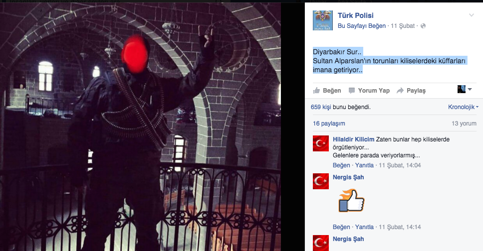 ‘Türk Polisi’ isimli bir sosyal medya hesabından, bir özel harekat polisinin, Diyarbakır Sur’da bulunan Surp Giragos Ermeni Kilisesi’nde çekilen bir fotoğraf paylaşıldı. Paylaşılan fotoğraf ve yorumlar tepkilere neden oldu.