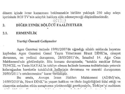 Raporda en dikkat çekici bölümlerden biri ‘Diğer Etnik Bölücü Faaliyetler’ başlıklı bölüm. Bu bölümde Ermenilik Rumluk ve Süryanilik bölümleri başlığı altında, MİT izlemeleri rapor haline getirmiş. Ermenilik başlıklı bölümde ‘Yurtiçindeki önemli gelişmeler’ başlığı altında Dink davasıyla ilgili gelişmeler var. Rapordaki ifade şöyle: