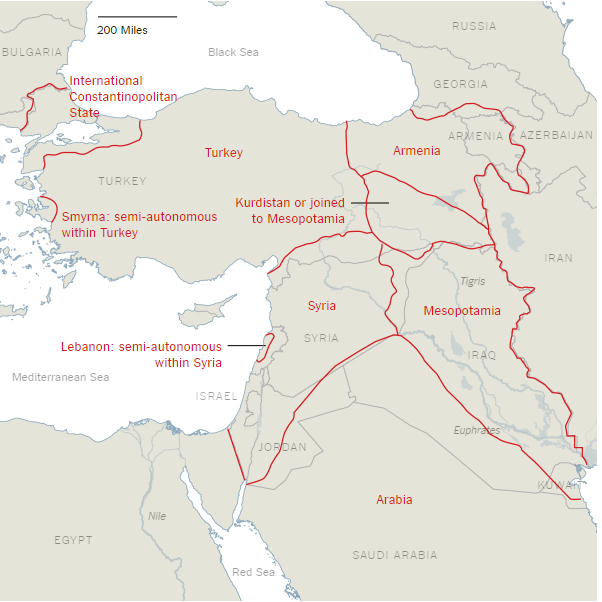 Haritaya göre Osmanlı topraklarının İstanbul ve çevresini içine alan Constantinopolitan State, İzmir‘in bulunduğu Smyrna, Kürdistan, Erzurum ve çevresini de kapsayan Ermenistan, Mezopotamya, Suriye ve Türkiye olarak altı parçaya ayrılıyor.