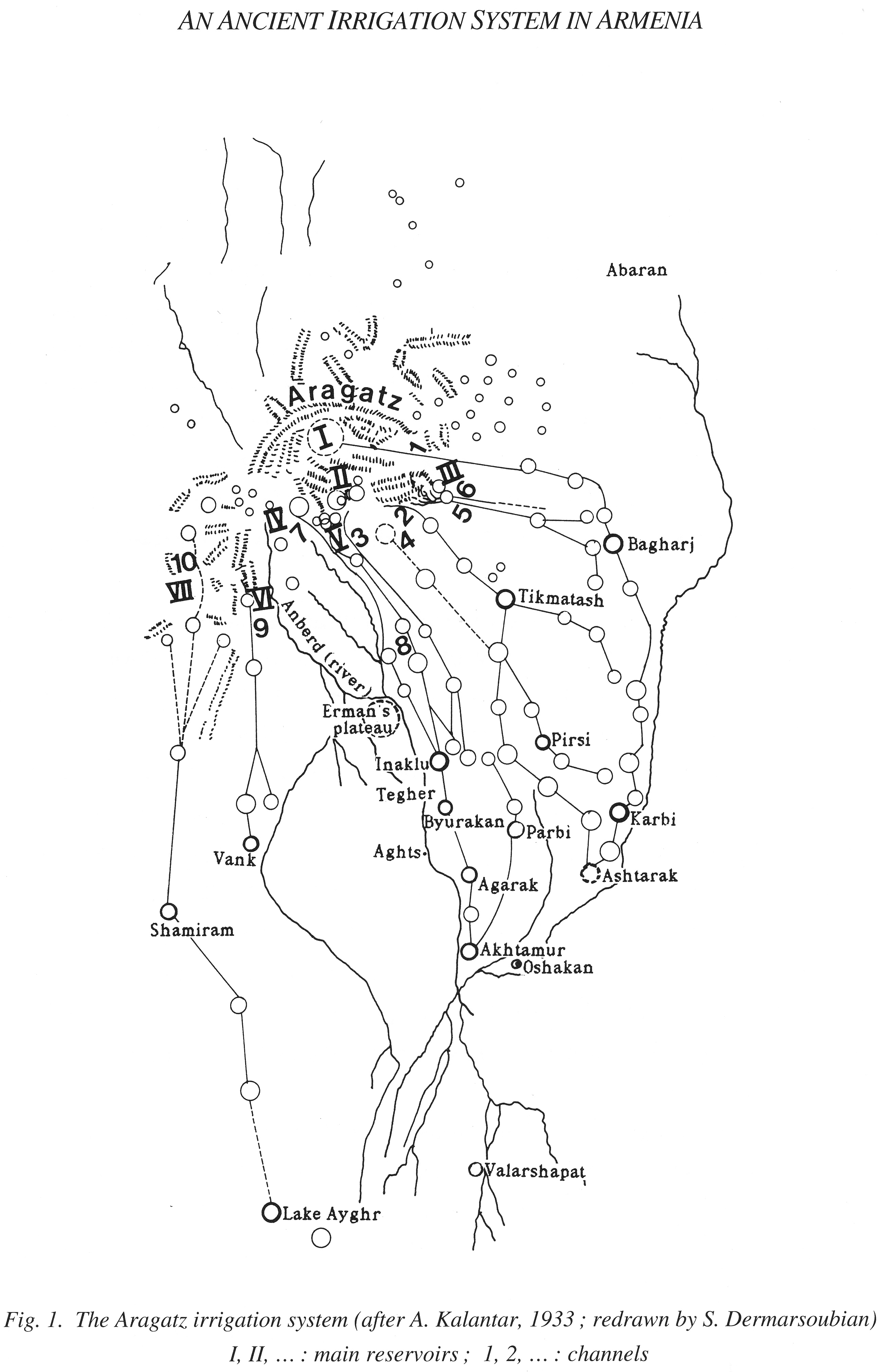 Aragads Dağı’nın tüm güney yamacını örten su dağıtım sistemi, antik Ermenistan’ın mimari düşüncesi ile toplumun devasa çalışmasının neticesi olup, büyük bir ihtimalle, üretim ekonomisi zamanında şekillenmeye başlamış, fakat büyük oranda bronz ve erken demir çağlarında tamamlanıp, faaliyete geçmiştir. Sistem, onlarca büyük ve küçük suni göletlerden ve bunları birbirine bağlayan, eriyen karlar ile yağmur sularının biriken suyunu Aragadsotın bölgesinin ön-dağlık ve ovalık bölgesiyle, Ararat Ovası’nın kavurucu bölgelerine ulaşmasını sağlayan karmaşık kanal sisteminden oluşmaktaydı.