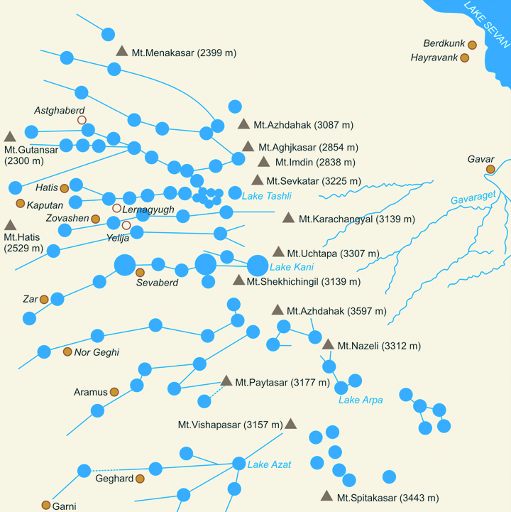 Bronz çağı ustaları eliyle Medsamor’daki bir kayanın üzerine işlenen bu su dağıtım sisteminin resmedildiği harita-şema, günümüze ulaşmıştır. Antik su mühendisleri, dağın hidrografisini derinlemesine inceleyip, su havuzlarını, binlerce yıl boyunca, günümüze kadar (Kare Lic “Taş Gölü”) suyla dolmasını sağlayan yerlere kurarlar. Bu suni su havuzlarının kıyılarında da ejder anıtları dikilmiştir.