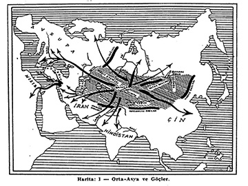 İkinci dikkat çeken tema, Orta Asya kökleri ve göçleri; tarih tezlerine yer veren bölüm Atatürk ile beraber dünya haritasına bakan iki kişi ve bir çocuğun yer aldığı bir fotoğrafla başlar; gözler Orta Asya’ya dönüktür: Türk Anayurdu. Takip eden sayfalarda Orta Asya’daki denizin varlığı, tarih öncesi parlak bir Türk medeniyetinin oluşu ve tüm dünyayı medeniyete kavuşturacak göçler tartışmasız tarihi gerçekler olarak kabul edilir. Tam sayfa harita, merkezinde Türk Anayurdu’nun yer aldığı Orta Asya kıtasını temsil eder, haritada Türklerin Çin, Hindistan, Yakın Doğu, Mısır ve İrlanda’ya kadar Avrupa’ya giden göçleri gösteren bir dizi karışık ok ağı yer alır. Kökeni Cahun’a dayanan bu harita gelecek nesillerde de hala önemlidir.