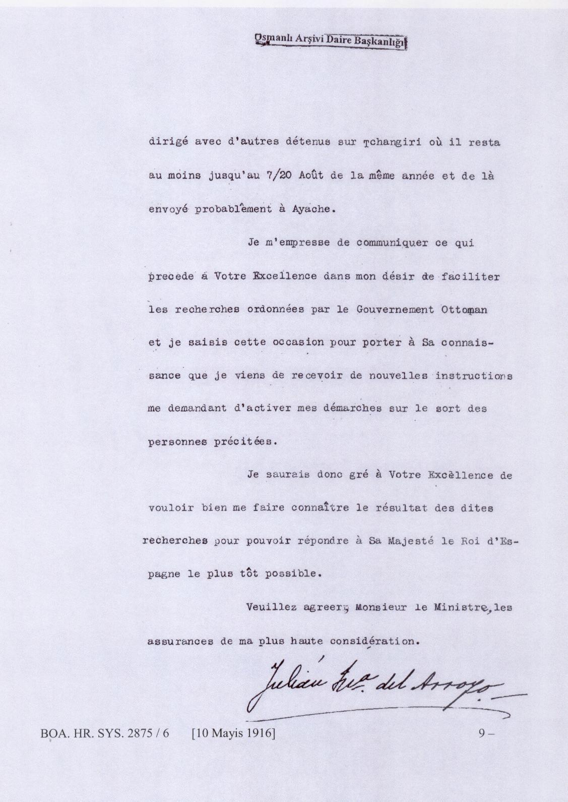 Bu belgelerin bilim adamları ve genel olarak tüm okurlarımız arasında büyük ilgi uyandırmış olduğundan dolayı, Akunq.net tarafından 1916 Mayısında İspanya’nın Osmanlı İmparatorluğu’ndaki temsilcisinin, o dönemdeki Osmanlı dışişleri bakanı Halil Menteşe’ye yönelik resmi mektubu da yayınlanmaktadır. Mektuptan görüleceği üzere İspanya kralı 1916 yılında Daniel Varujan ve diğer Ermeni aydınlarının, Osmanlı yöneticilerinin emriyle çoktan katledilmiş olduğunu henüz bilmeyerek, onları kurtarabilme konusunda ümit beslemektedir.