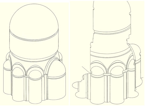 Bu görüntüler, Halaskar Kilisesi’nin iç geometrisini gösteren bilgisayarda çizilmiş üç boyutlu modelidir. 1980’lerin sonlarında, “solid modelling software” halen çok ilkelken çizilmiştir. Modelin basit geometrik şekillerden yapılması gerekmiştir – küreler, silindirler ve küpler. Yakın sureti halen yaratılabilir; bu da, kilisenin geometrik saflığına işarettir.