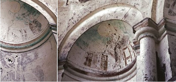 Daha sonraki bir tarihte badana ile örtülmüşe benzerler (kilise, cami olarak kullanılmış mıdır?) ve bugün çok tahrip edilmiş durumdadırlar. Yıkılan altar apsisinin, İsa’yı tahtta gösteren bir resmi, diğerlerinin de İsa ile Dört Vaiz’in hayatını konu eden resimleri varmış.