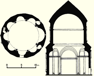 İçinin, altar apsisi diğerlerinden daha büyük olmak üzere, sekiz apsisi varmış. Altar apsisinin her iki tarafında, duvarın kalınlığına sıkıştırılmış küçücük şapel varmış. Yapıyı zayıflatan ve kilisenin yıkılmasına neden olan, bu iki şapel ve geniş tutulmuş apsisin o bölüme verdiği hasar olsa gerek.