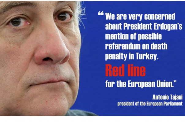 Tajani, Erdoğan’ın darbe girişiminden bu yana sık sık dile getirdiği ve gerekirse referanduma gidilebileceğini söylediği idam cezasına ilişkin de şunları söyledi: “Türkiye’de idam cezasına ilişkin sözü edilen muhtemel bir referandumdan çok endişeliyim. Bu, Avrupa Birliği’nin kırmızı çizgisidir.”