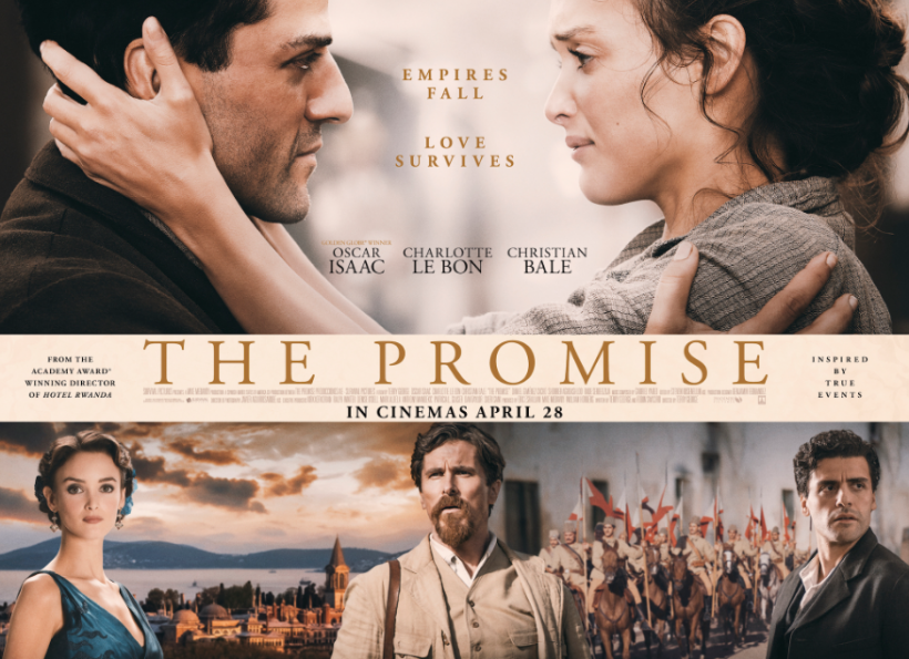NEW JERSEY– ‘The Promise’, geçen hafta ABD’de ve bazı Avrupa ülkelerinde gösterime girdi. Yönetmenliğini Oscar ödüllü Terry George’un üstlendiği filmin senaryosunu George ile birlikte Robin Swicord kaleme aldı. Prömiyeri geçen yıl Toronto Uluslararası Film Festivali’nde yapılan filmin konusu, bir aşk üçgeninin arka planında, Osmanlı İmparatorluğu’nun son döneminde Ermeni halkının yaşadığı acılar. Filmde Golden Globe ödüllü Oscar Isaac, Charlotte Le Bon, Oscar ödüllü Christian Bale, Angela Sarfyan ve Kevork Malikyan gibi isimler rol alıyor. Film, Ermeniler dışındaki ABD’lilerden de büyük ilgi gördü.