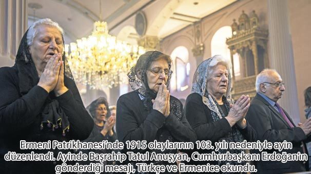 Türkiye Ermenileri Patrikhanesi tarafından 1915 olaylarının (Ermeni Soykırımı-‘Akunq’ web sayfası) 103. yılında ayin düzenlendi. Kumkapı’daki Meryem Ana Kilisesi’nde yapılan Surp Badarak (Rabbin sofrası) ayinini, Başrahip Zakeos Ohanyan yönetti.