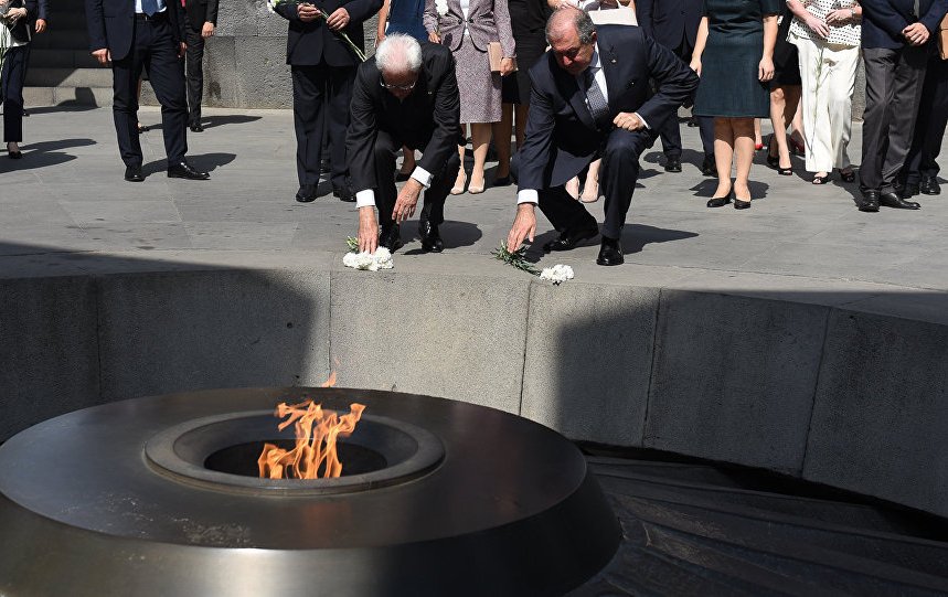Resmi ziyaret kapsamında Ermenistan’a gelen İtalya Cumhurbaşkanı Sergio Mattarella, Ermenistan Devlet Başkanı Armen Sarkisyan’ın eşliğinde, Ermeni Soykırımı Kurbanları “Tsitsernakaberd” anıtını ziyaret edip, Ebedi Alev’e çiçekler koydu.