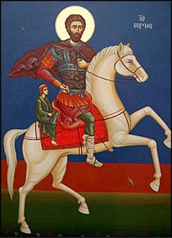 Dini bütün bir Hıristiyan olan Ordu Komutanı Sarkis (Sergius – Sercius), İmparator Konstantin 1.inılımlı ve hoşgörülü din politikasından esinlenerek, pagan olan Roma İmparatorluk Ordusunda Hristiyanlığı vaaz edipyaymayave misyonerlik yapmaya başlar ve çoğu kişiyi Hristiyan dinine çevirir. Ancak, Roma İmparatorluğunun son Putperest İmparatoru olan Julianos’un tahta gelmesi ile durum değişti, ılımlı politika yerini, Hristiyanlığa karşı katı, sert ve baskı politikasına bıraktı, Hıristiyanlar şiddete ve işkenceye maruz kaldılar :Komutan Sarkis zor durumlara ve sıkıntılara düştü ve oğlu Mardıros ile ülkeyi terk etmeye karar verdi ve Hıristiyan bir ülke olan Ermenistan’a gitti, orda Ermeni Kralı Büyük Dırtad’ın torunu Kral Diran’ın hizmetine girdi (342-350): Bu arada, Roma İmparatoru putperest Julianos veorduları Doğu ve Kafkas ülkelerine kadar ulaşmışlardı. Ermeni Kralı Diran Hristiyan olan ülkesini işgal tehlikesinden korumak için, Sarkis’in İran’a gitmesini önerdi: