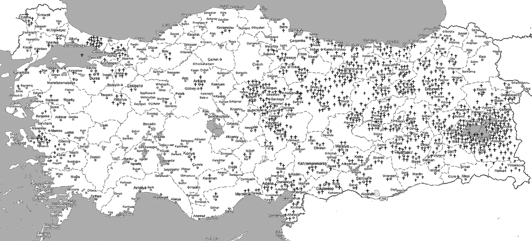 68. Sivas: Merkez ve köyleri, Hafik, Zara, UlaĢ, Yıldızeli, Sarız, Bünyan)Ekrek, Gemerek. 110 kilise.
