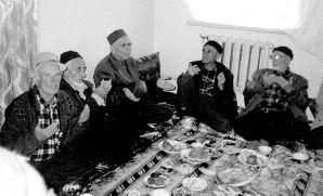 Evin geniş avlusunda ev sahibiyle birkaç orta yaşlı adam bizi karşılıyor. Onların, sülalelerin büyüklerinin meclisine katılma hakkı yok. Avlu kalabalık, kadınlar sofra hazırlıyorlar. “Sofra”, halı ve kilimlerle örtülü ve yerden yarım metre yükseklikte bulunan platformlar. Bu platformların üzerinde çember şeklinde bağdaş kurmuş oturuyorlar. Ev sahibi, soran bakışıma cevap vererek: “Bu sofra şekli bize ait değil, Orta Asyalılar’dan almışız” diye açıklıyor.