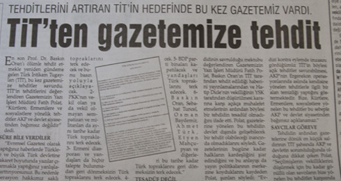 Evrensel gazetesine Türk İntikam Tugayı (TİT) imzalı bir tehdit mektubu yollandı. TİT imzalı ve “Açık Mektup” başlığıyla gönderilen yazıda “15 Ağustos’a kadar taleplerinin yerine getirilmemesi durumunda Diyarbakır ve İstanbul’da kanlı eylemler yapılacağı” söyleniyor. TİT’in talepleri ise Kürtler, Ermeniler ve Baskın Oran, Sebahat Tuncel gibi demokrat aydınların Türkiye’yi terkedip bunu basın yoluyla açıklaması.