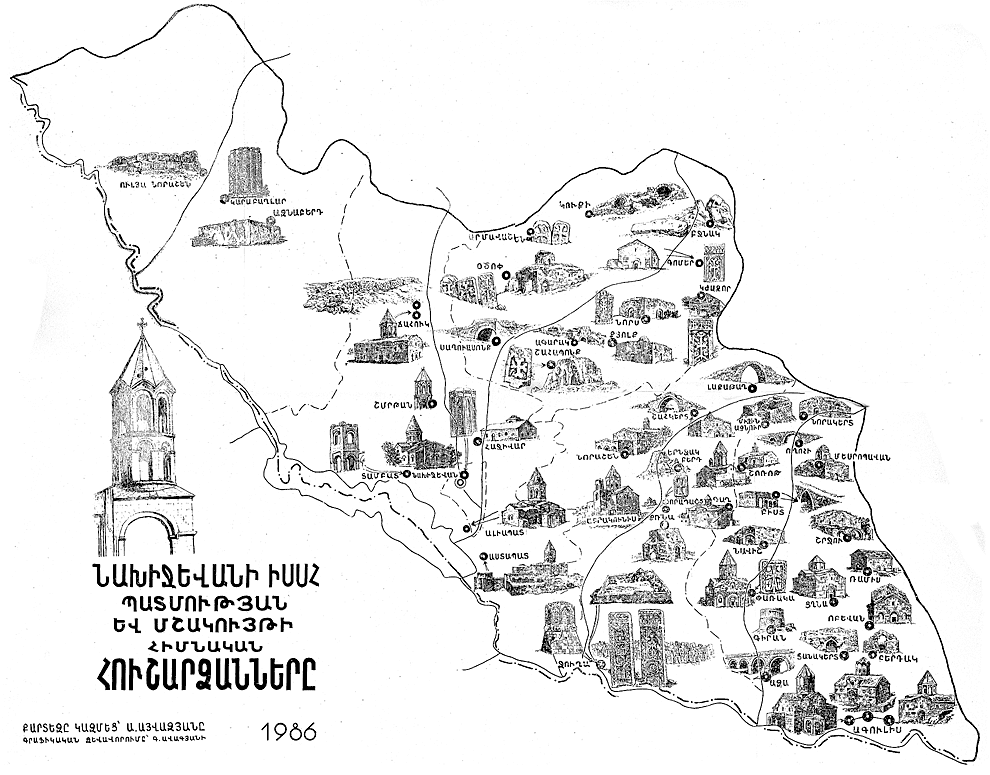 Mimari: Nakhicevan bölgesinde bronz, taş ve topraktan yapılmış eşyalar, kiklopik yapıların (M.Ö. II.-I. binyıllar) kalıntıları bulunmuştur. Ünlü Ortaçağ yapılarından Astapat’ın Karmir (kızıl, XVII. yy.) ve Surb Vardan (XVII. yy.), Kuki’nin Surb Nışan (XIII.-XIV. yy.), Aprakunis’in Surb Karapet (XII.-XVIII. yy.), Paraka’nın Surb Hakob Hayrapet (XI.-XVIII. yy.) manastırları, Yerıncak, Şahaponk Arba, Çahuk kalelerini sayabiliriz. Dini yapılar genellikle üç apsitli veya dört nişli kubbeli bazilik yapılar olmuşlardır. Birinci tip yapılardan Bist’in Surb Astvadsadsin (1687) ve Surb Nışan (XVII. yy.), Şırcu’nun (XVII. yy.), Nirgud’un (XVIII. yy.), Paraka’nın Surb Şımavon (1680), Şorot’un Surb Lusavoriç (1708) kiliselerini vs. sayabiliriz. Kubbeli baziliklerden ise Odsot’un Surb Astvadsadsin (XII.-XVII. yy.), Gağ’ın Surb Grigor, Tsığna’nın Surb Astvadsadsin manastırları, Mesropavan’ın Surb Grigor Lusavoriç manastırı, Agulis’in Surb Hovhannes Mıkırtiç, Surb Kristapor, Surb Yerrordutyun (XII.-XVII. yy.) kiliselerini örnek göstermek mümkündür. Katlı absitli sunak ve taş ile tuğlanın birlikte kullanılması, Ortaçağ Ermeni mimarlığı Nakhicevan okulunun özelliklerinden biridir. Kubbeli bazilik kiliselerin esas boyutu kesilmiş tüf taşından inşa edilip, yükselen davulu ve sivri uçlu çatısı tuğladan (Agulis’in Surb Kristapor, Surb Yerrordutyun, Şorot’un Surb Hakob kiliseleri vs.) örülmekteydi.