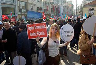 HOCALI katliamının 20. yıldönümü nedeniyle İstanbul Taksim Meydanı’nda 26 Şubat 2012’de düzenlenen mitingde “Hepiniz Ermeni’siniz, hepiniz piçsiniz”, “Hrant’ın piçleri, yıldıramaz bizleri” ve “Dişe diş, kana kan, intikam” yazılı pankart ve döviz açanlarla ilgili soruşturma tamamlandı. İstanbul Cumhuriyet Başsavcılığı tarafından hazırlanan iddianamede, pankatları taşıyan Umut A., Burak K., Kazım B., Samet A., Onur G., Recep A., Derya K., Hasan Hüseyin K., Arzu B. ve Cihan D. sanık olarak yer aldı. İddianamede sanıklarla ilgili şöyle denildi:
